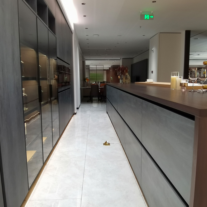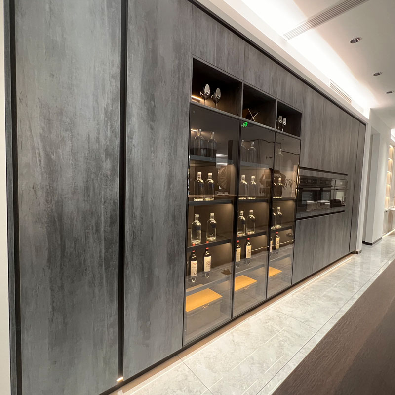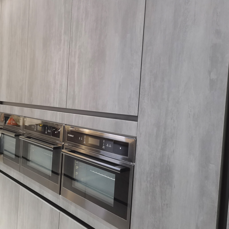 Armoire de cuisine stratifiée industrielle à la mode de nouveau style avec un traitement ancien de couleur comme l'altération de la roche, la sensation au toucher est douce et de qualité, le panneau de porte en verre assorti avec le cadre en aluminium, rend le sens élevé de l'effet de décoration de cuisine. Le matériau est imperméable, facile à nettoyer et le style n'est pas facile à enlever.