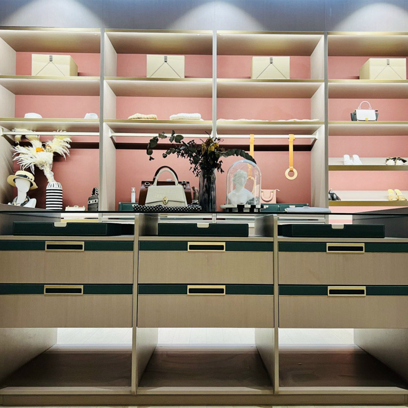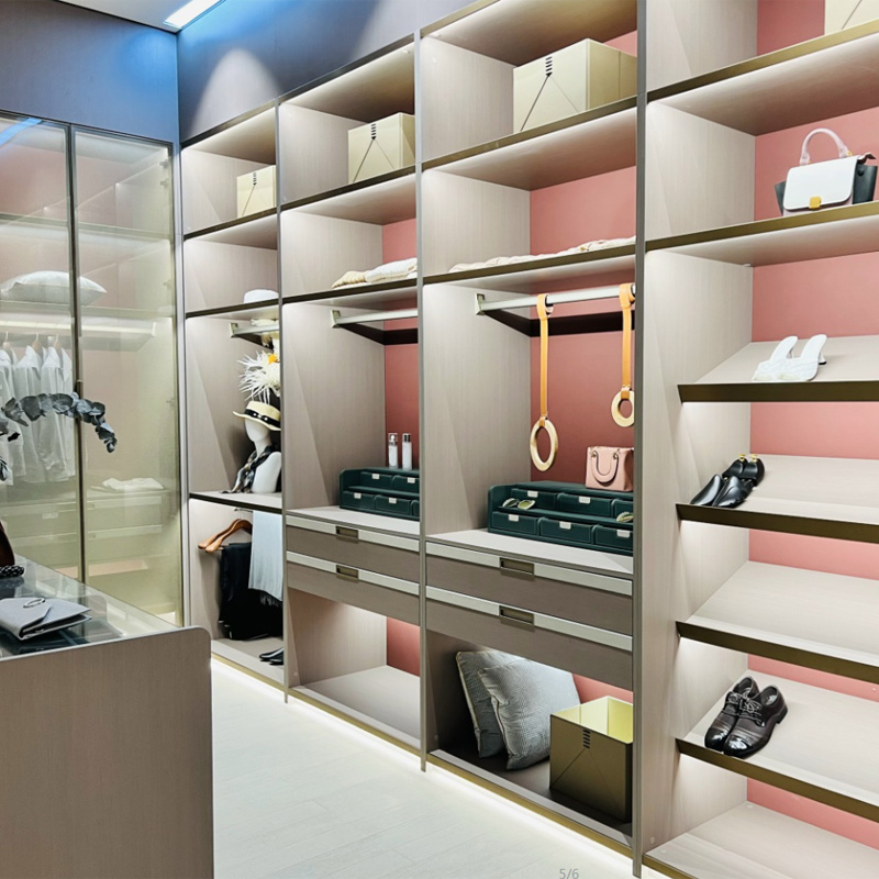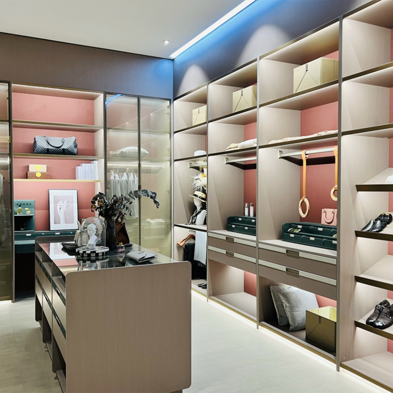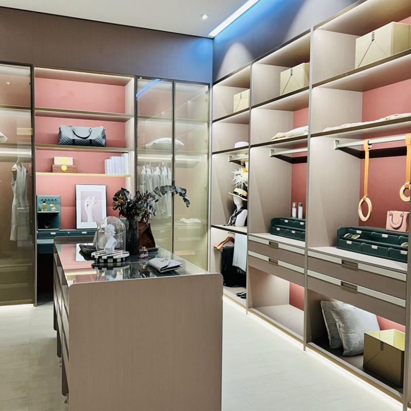 Ce dressing conçu avec une carcave en mélamine, l'effet visuel est luxueux et vivant, convient aux jeunes qui réussissent, application pour les villas, les projets de maisons de ville.