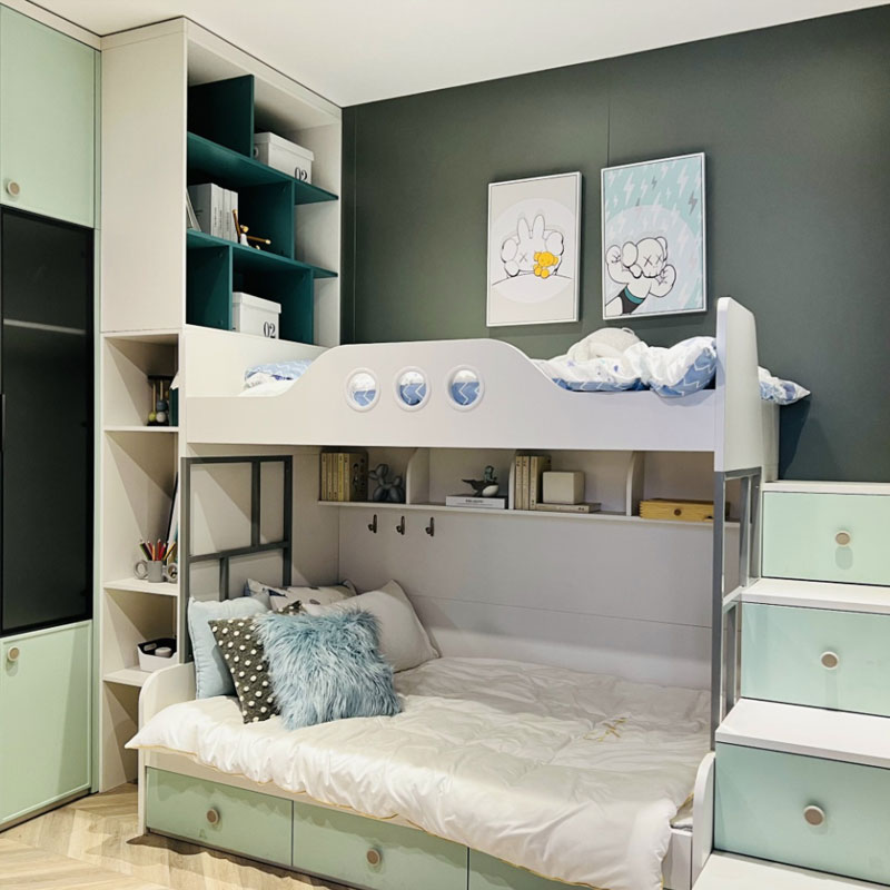La chambre d'enfant Sinoah est produite avec des couleurs et des styles vifs et vifs, en accord avec la nature de l'enfant et utilise pleinement l'espace de la pièce.