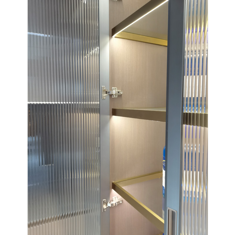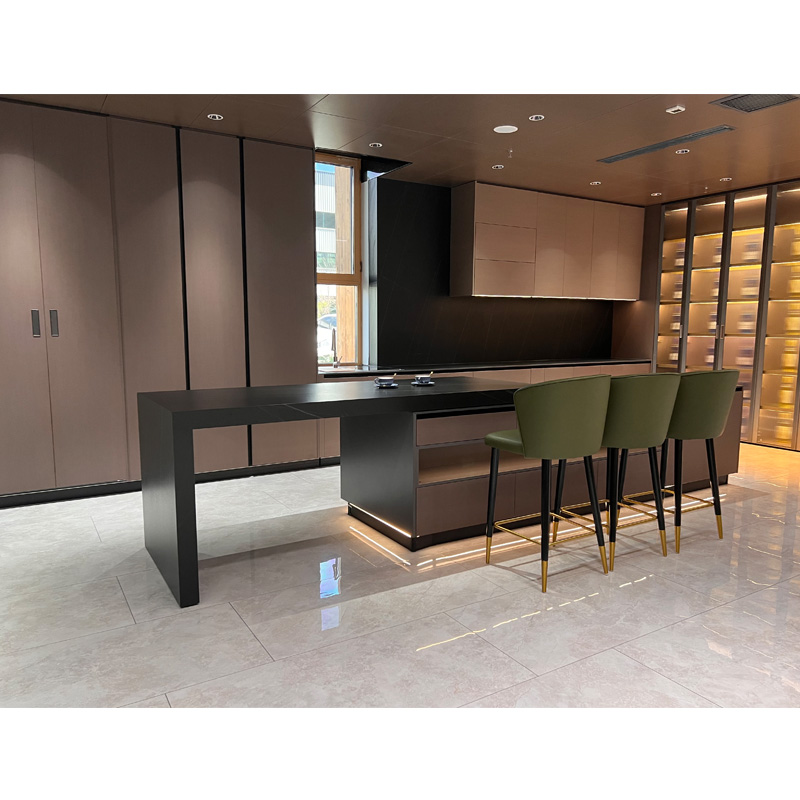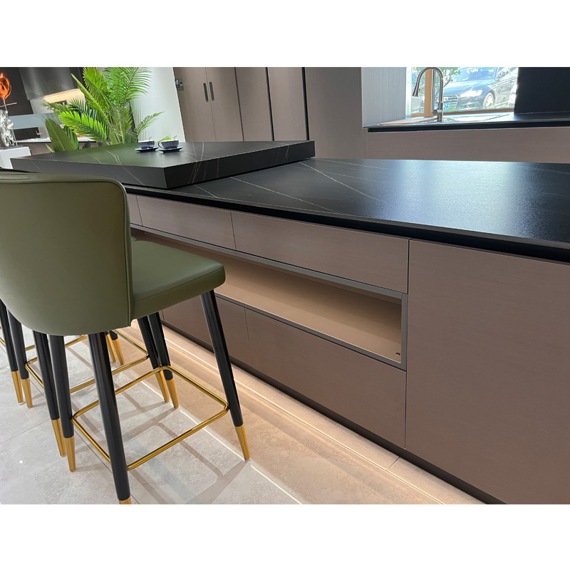 Ces armoires de cuisine intelligentes sont des armoires de cuisine de luxe en forme de L avec des armoires de cuisine en verre, des armoires de cuisine marron et des armoires de cuisine en verre de conception merveilleuse pour vous offrir une expérience de luxe légère lorsque vous cuisinez. Les armoires de garde-manger sont optimisées pour contenir tous vos costumes de cuisine. .