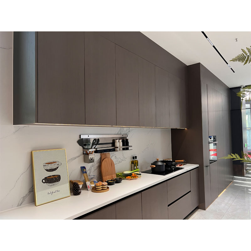Les armoires de cuisine en stratifié haut de gamme de la cuisine intelligente utilisent le brun comme couleur principale, et la texture mate est plus avancée en termes de sensation visuelle et de main. Des tailles régulières et non conventionnelles sont disponibles, et les armoires en forme de L, de L et de U peuvent être personnalisées, avec le libre choix des matériaux et des couleurs des armoires et des comptoirs.