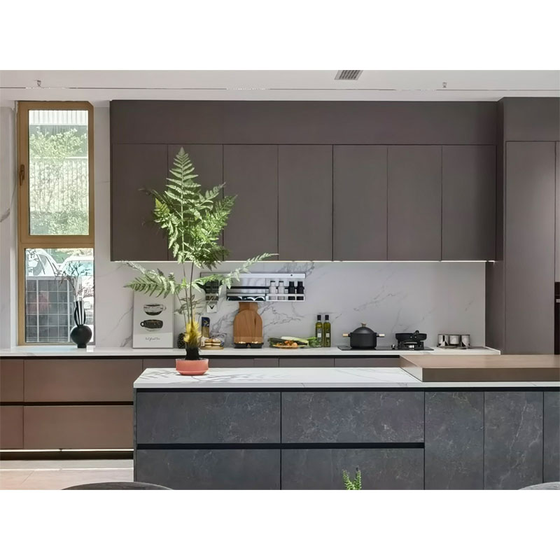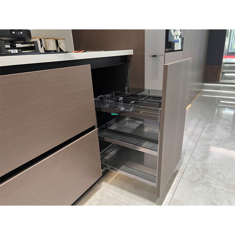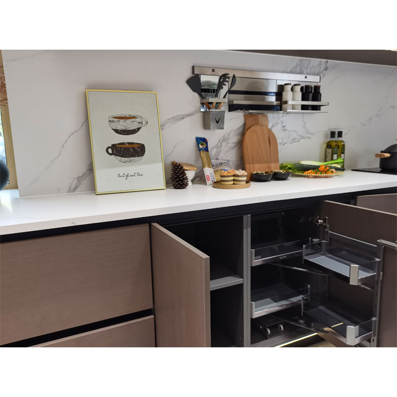 La carcasse adopte des panneaux de particules écologiques et du matériel de fabricants de marques bien connues. SINOAH fournit toujours des armoires à la fois texturées, sûres et durables pour toutes les familles. L'intérieur des armoires de cuisine en stratifié haut de gamme de la cuisine intelligente peut être équipé de divers matériels fonctionnels en fonction de vos besoins, et les fournitures de cuisine peuvent être triées et placées. L'espace à l'intérieur de l'armoire peut être pleinement utilisé grâce à des conceptions créatives telles que des paniers de rangement rabattables et des étagères de rangement à table rotative, ce qui rend la cuisine et les repas quotidiens plus pratiques et confortables.