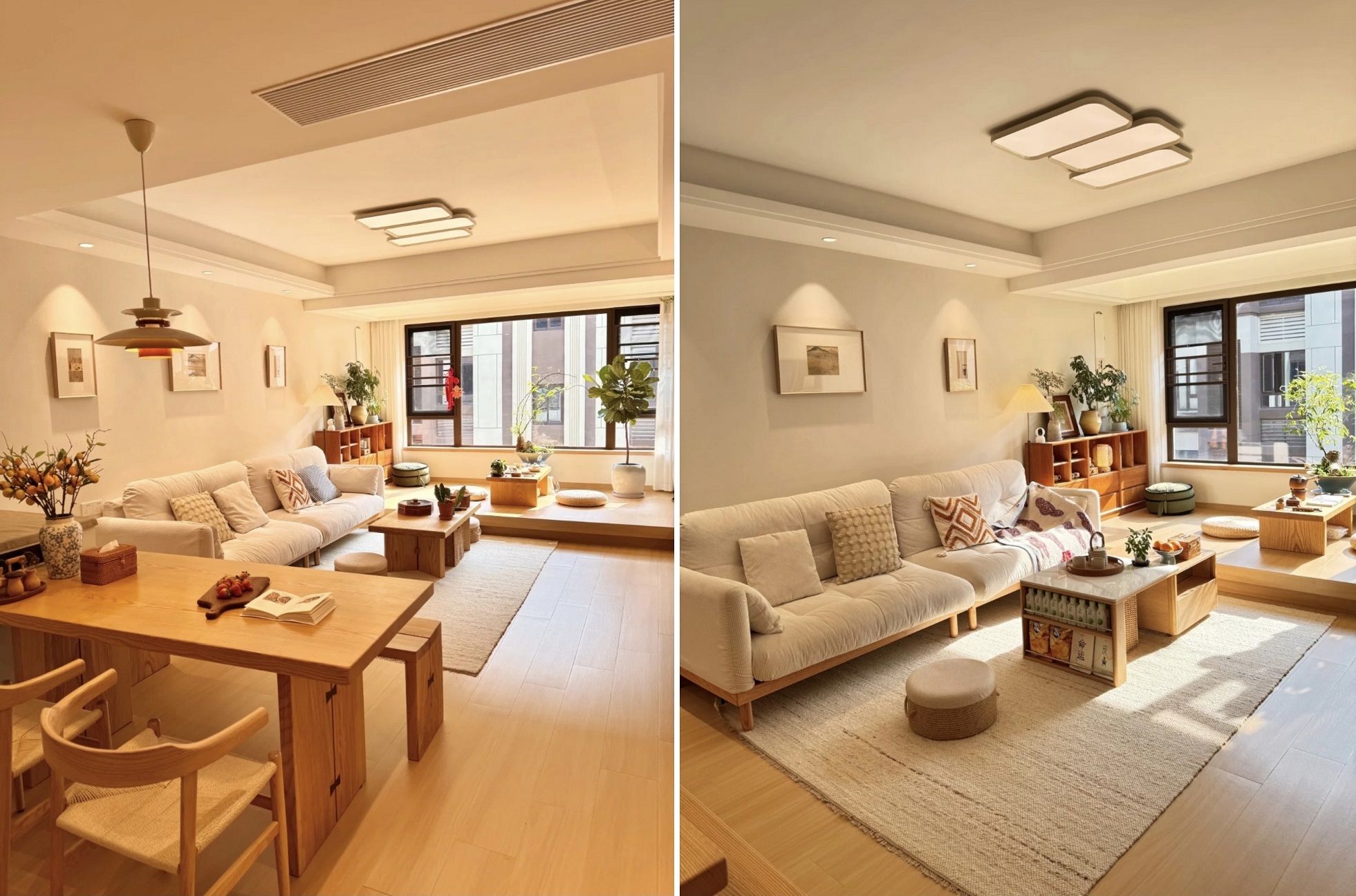 6. Enfin, il y a mon grand canapé! Après avoir fait beaucoup de devoirs, j'ai finalement choisi un canapé nuageux de crème en tissu de tissu de 2,8 mètres avec une base de chêne rouge nord-américain et une large profondeur assise. Il est doux et confortable pour s'asseoir et le canapé est amovible et lavable. Ce canapé correspond vraiment au style de décoration de style bois d'origine de ma maison!