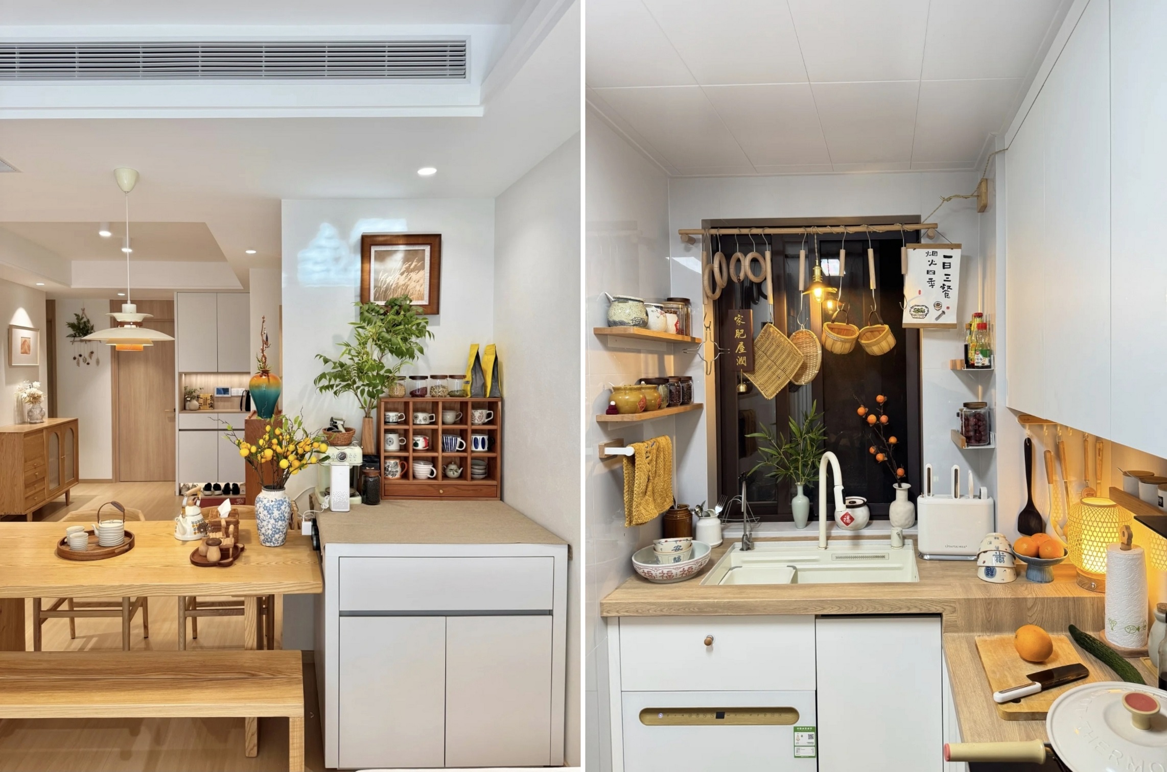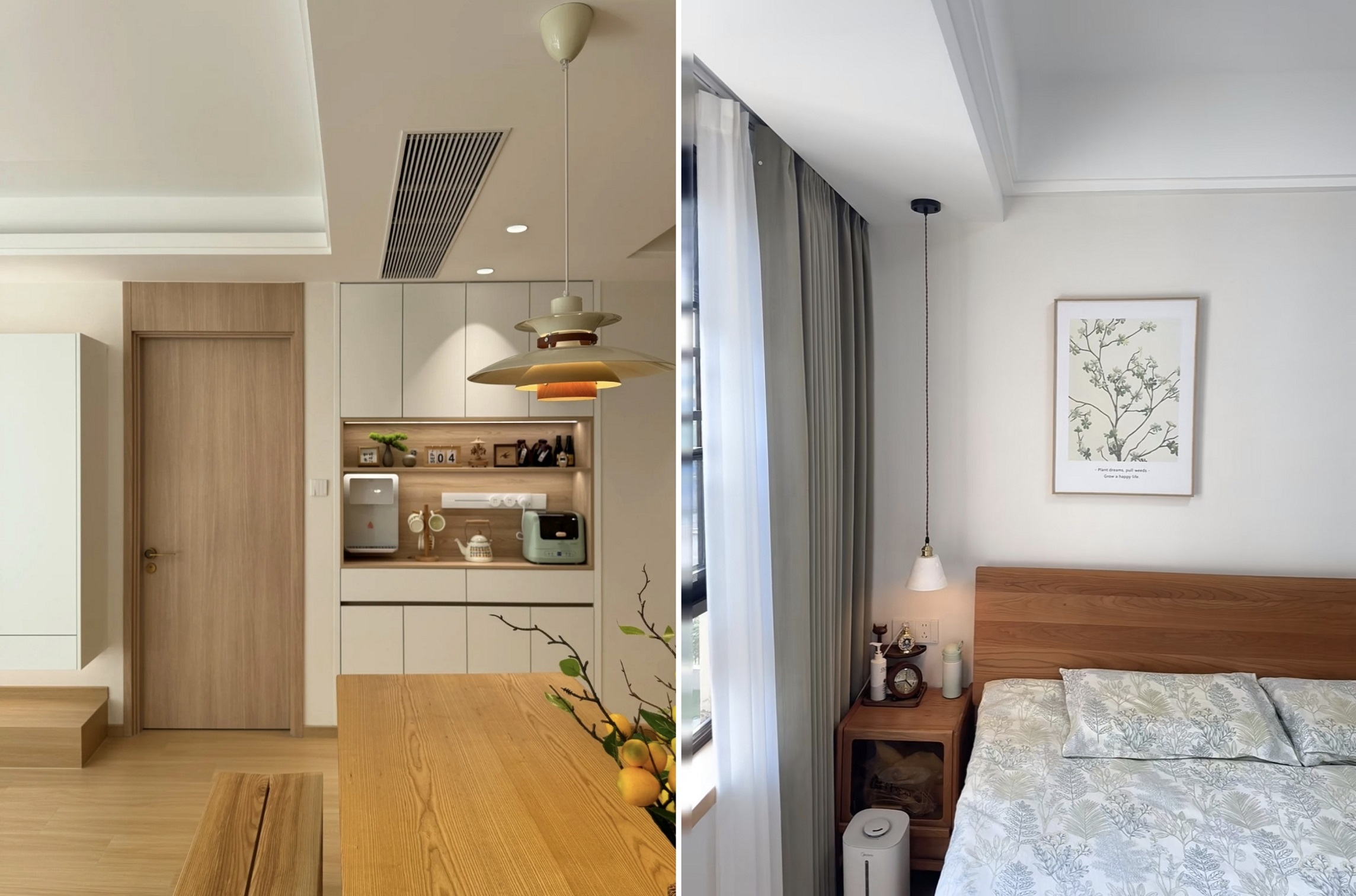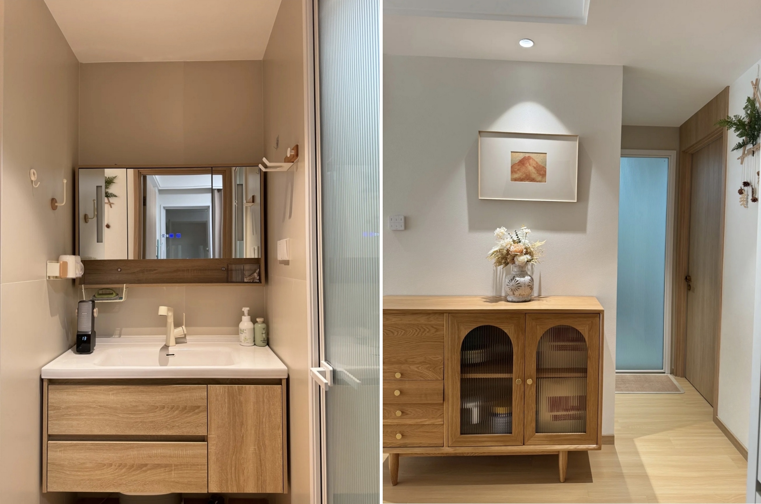 4. Les portes de l'armoire sont proches de la couleur du mur, et le corps de l'armoire est proche des carreaux de grain de bois, ce qui rend l'effet visuel très unifié.